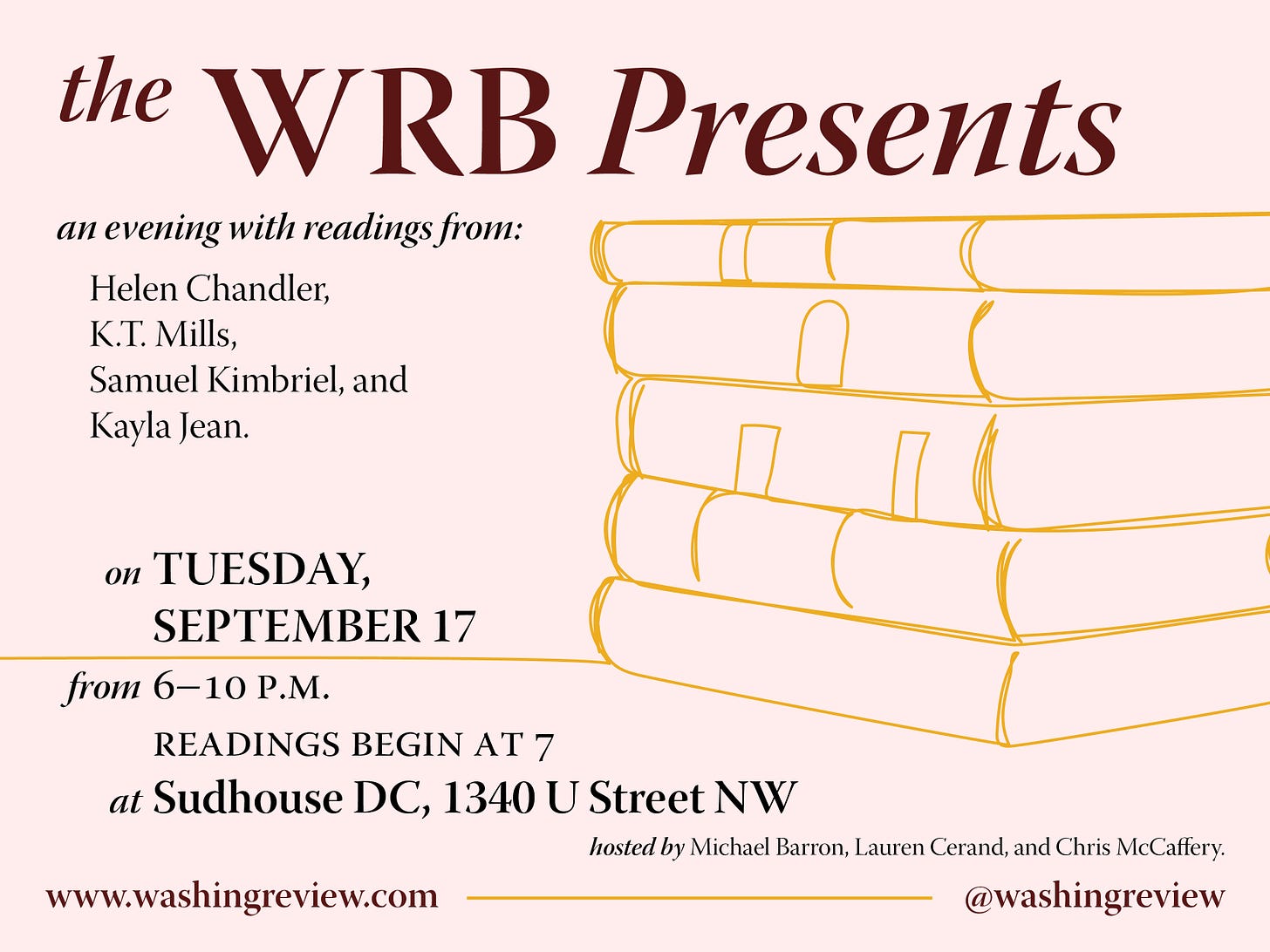The WRB Presents the next in a regular series of readings attracting and spotlighting literary talent in Washington, D.C., hosted by Michael Barron, Lauren Cerand, and