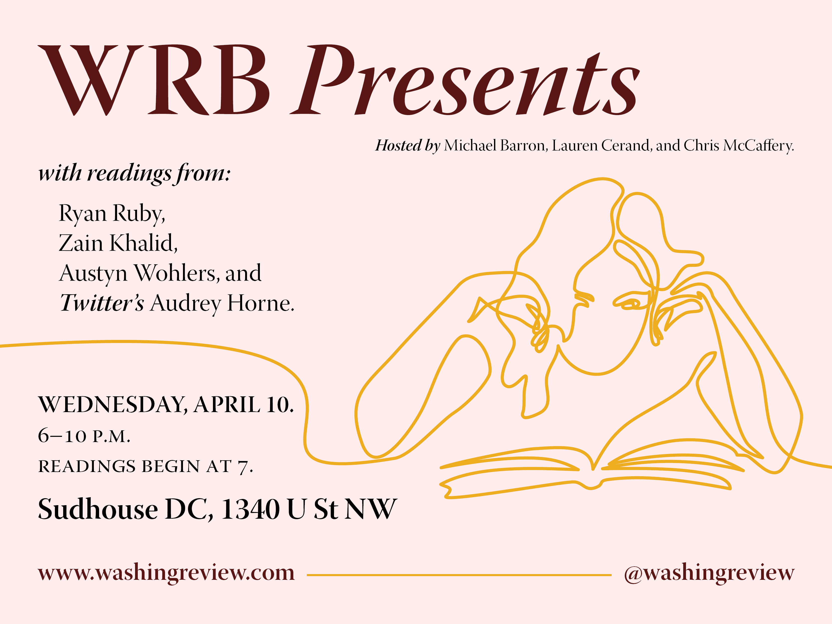 with readings from Ryan Ruby, Zain Khalid, Austyn Wohlers, and Twitter’s Audrey Horne.