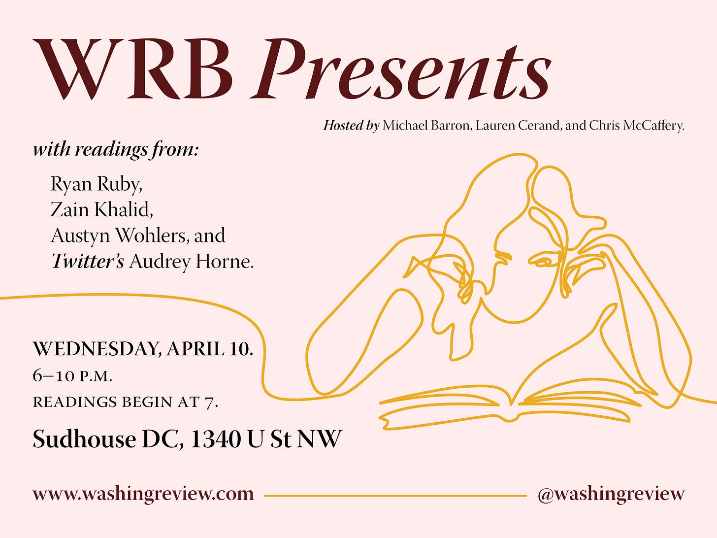 The WRB Presents the first in a regular series of readings featuring authors from without and within Washington, D.C., hosted by Michael Barron, Lauren Cerand, and Chris McCaffery. On April 10, these four writers will read their work: